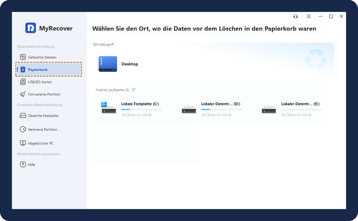 MyRecover ist eine kostenlose Software zur Wiederherstellung des Papierkorbs, die von über 300.000 Benutzern getestet wurde. Sie stellt effizient alle Dateiformate wieder her, einschließlich Dokumente, Bilder, Videos, Audio, Archive, usw.