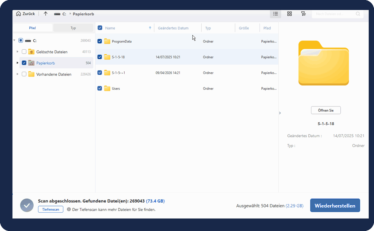 „Mit MyRecover können Benutzer Dateien aus geleertem Papierkorb problemlos wiederherstellen. Die Tiefenscan-Funktion erhöht die Wahrscheinlichkeit einer erfolgreichen Wiederherstellung von Dateien und gewährleistet eine gründliche Suche.“