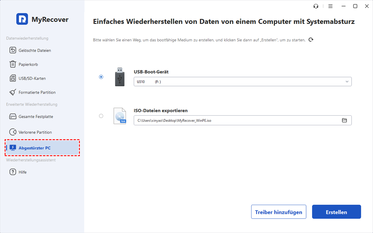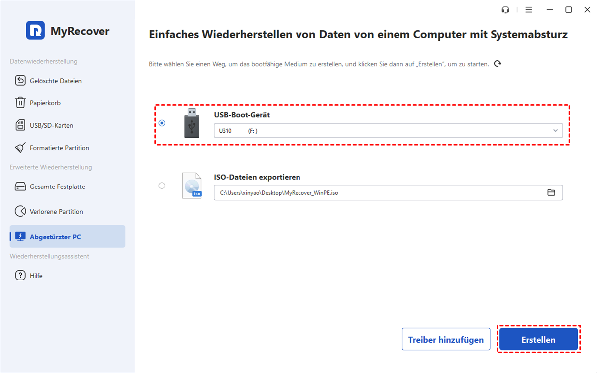 Methode 3. Bootfähigen USB-Stick erstellen unter Window 10 über MyRecover (am einfachsten)