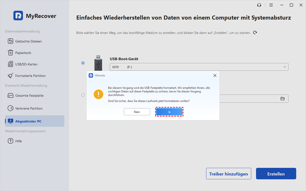 Wählen Sie in MyRecover Ihren USB-Stick als Ziel für die bootfähige Festplatte und klicken Sie auf Erstellen.