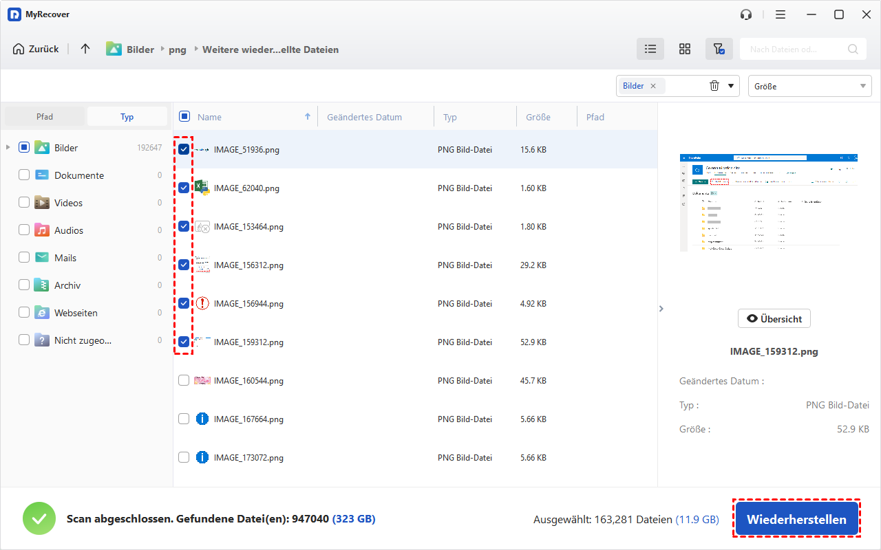 Es scannt Ihr Laufwerk automatisch und gründlich nach allen gefundenen Daten. Verwenden Sie die Suchleiste oder Filterfunktion, um schnell die benötigten Daten zu finden.