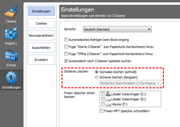 Wenn Sie „sicheres löschen“ (unter „Optionen“ > „Einstellungen“) aktivieren, kann CCleaner Dateien je nach Methode 1–35 Mal überschreiben. Dies erschwert oder verhindert die Wiederherstellung ohne professionelle Datenrettungstools.