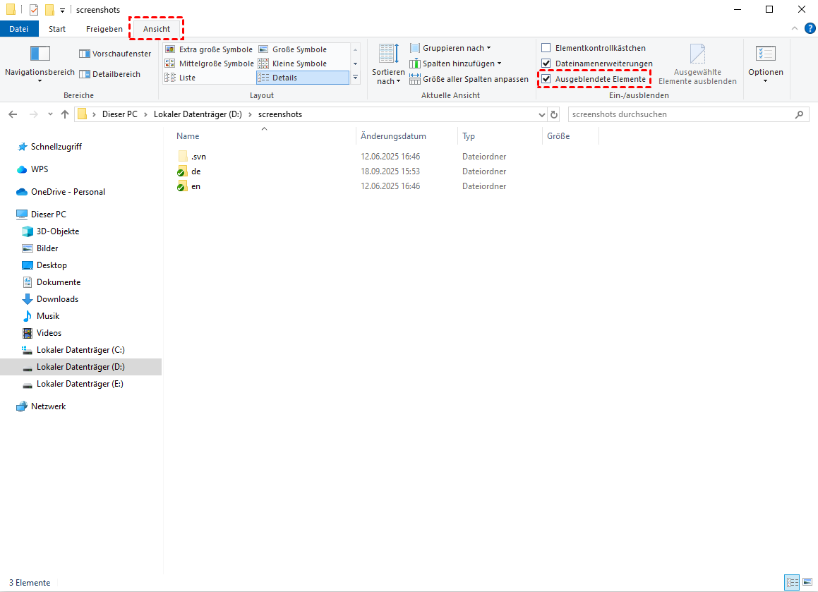 Ihre versteckten Dateien sollten nun sichtbar sein. Sollten die Dateien weiterhin versteckt sein, verwenden Sie stattdessen den Befehl „Attrib“: