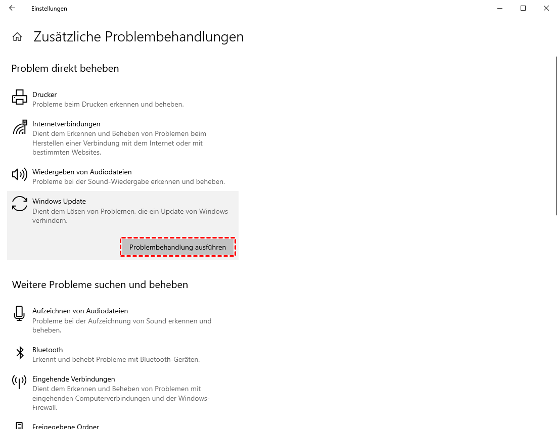 Windows verfügt über ein praktisches, integriertes Tool, das Probleme mit Updates automatisch erkennt und behebt. Gehen Sie zu Einstellungen > Update & Sicherheit > Problembehandlung > Zusätzliche Problembehandlungen und führen Sie die Problembehandlung für „Windows Update“ aus.
