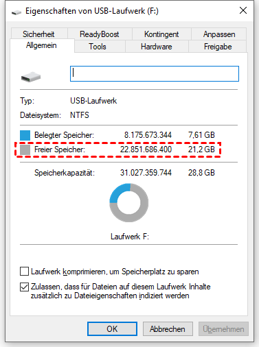 1. Den aktuellen Speicherplatz überprüfen: Öffnen Sie den Datei-Explorer (Win + E). Klicken Sie mit der rechten Maustaste auf Ihr Sicherungslaufwerk, wählen Sie „Eigenschaften“ und überprüfen Sie den verfügbaren Speicherplatz (vergleichen Sie ihn mit der Größe Ihrer Quelldateien).