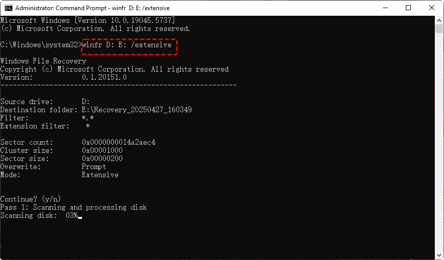 Schritt 3. Geben Sie im sich öffnenden Eingabeaufforderungsfenster folgenden Befehl ein: winfr D: E: /extensive. Ersetzen Sie „D“ durch den Laufwerksbuchstaben oder den Buchstaben der Partition, von der Sie Daten wiederherstellen möchten, und „E“ durch den Buchstaben des Ziellaufwerks.