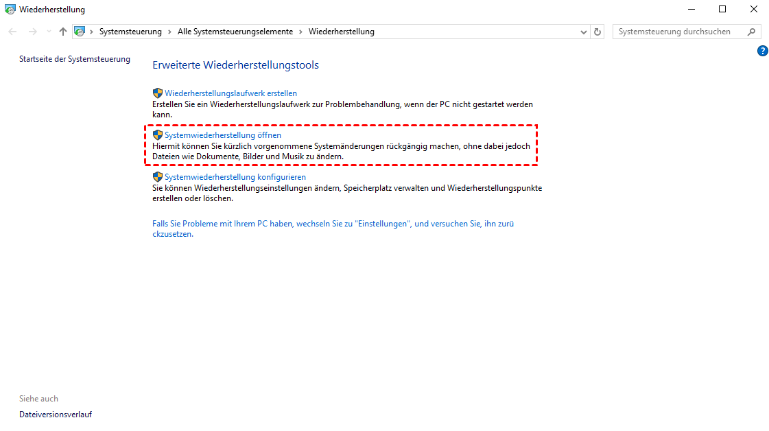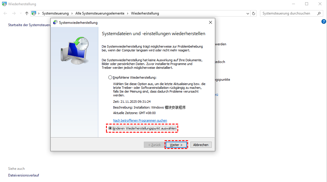 Schritt 2: Klicken Sie auf „Systemwiederherstellung öffnen“. Wählen Sie „Anderen Wiederherstellungspunkt auswählen“ und dann klicken Sie auf „Weiter“.