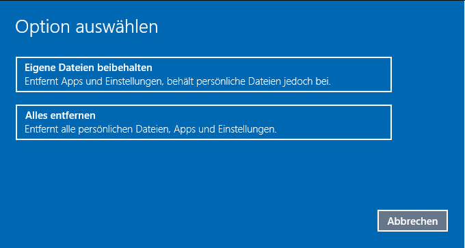 Bei der Option „Diesen PC zurücksetzen“ können Sie je nach Bedarf entscheiden, ob Ihre Dateien erhalten bleiben sollen oder nicht. Beachten Sie: Wenn Sie „Alles entfernen“ auswählen, werden alle Ihre persönlichen Dateien, Apps und Einstellungen gelöscht. Wenn Sie hingegen „Eigene Dateien behalten“ auswählen, werden nur Apps und Einstellungen gelöscht, Ihre persönlichen Dateien bleiben aber erhalten.