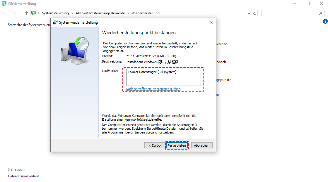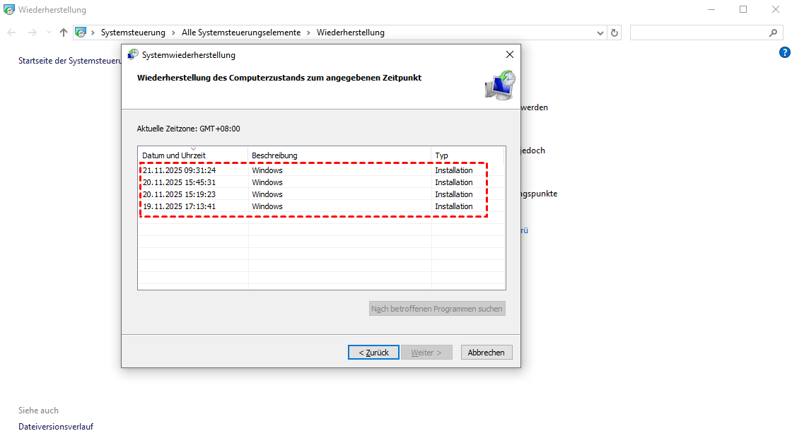 Sollte Ihr Computer nicht ordnungsgemäß starten, können Sie ihn im abgesicherten Modus starten und einen geeigneten Wiederherstellungspunkt auswählen. Ihr Computer wird dabei neu gestartet. Die Systemwiederherstellung hat keine Auswirkungen auf Ihre persönlichen Dateien wie Dokumente, Bilder oder E-Mails. Allerdings werden alle Programme und Treiber, die nach dem ausgewählten Wiederherstellungspunkt installiert wurden, deinstalliert und bereits deinstallierte Programme und Treiber wiederhergestellt.