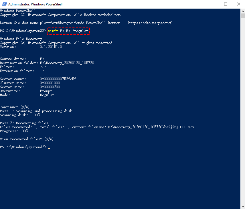 Geben Sie nun in der Windows PowerShell (Administrator) folgenden Befehl ein: `winfr F: E: /regular` (führt einen Schnellscan auf Laufwerk F: durch, um alle verlorenen Dateien zu finden und sie auf Laufwerk E: wiederherzustellen).