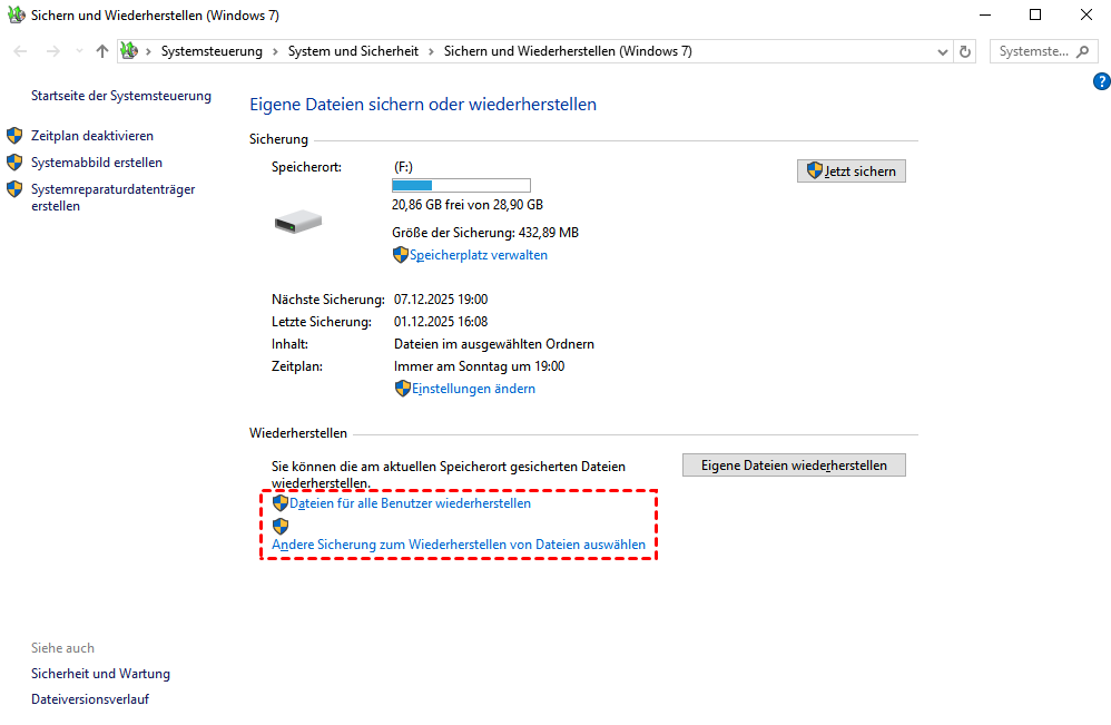 👉Sichern und Wiederherstellen (Windows 7): Auch unter Windows 10 weiterhin verfügbar für Benutzer, die das ältere Sicherungssystem verwendet haben.