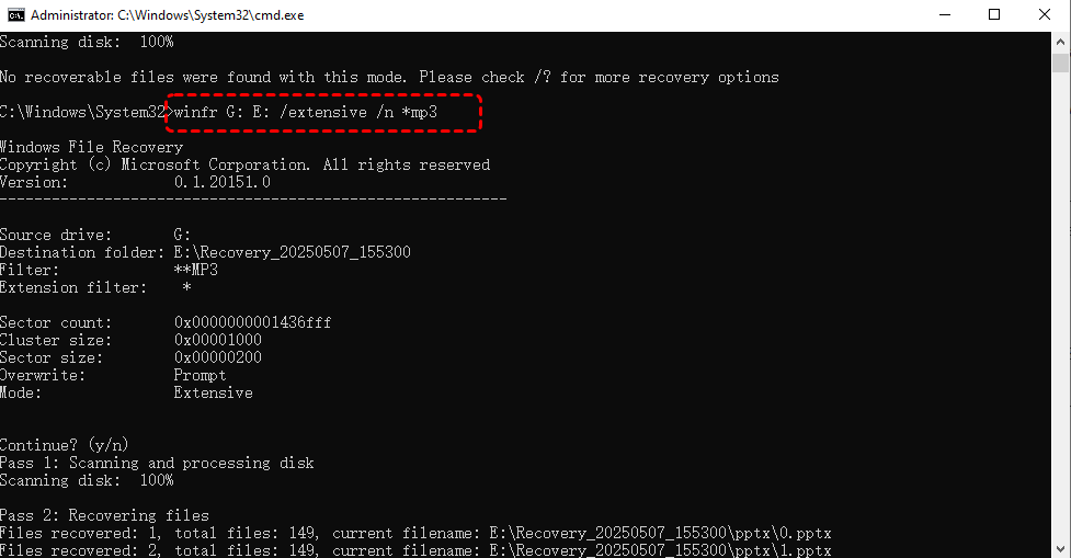 Sie können auch verschiedene Wiederherstellungsmodi verwenden, z. B. „/regular“ für Schnellscans.