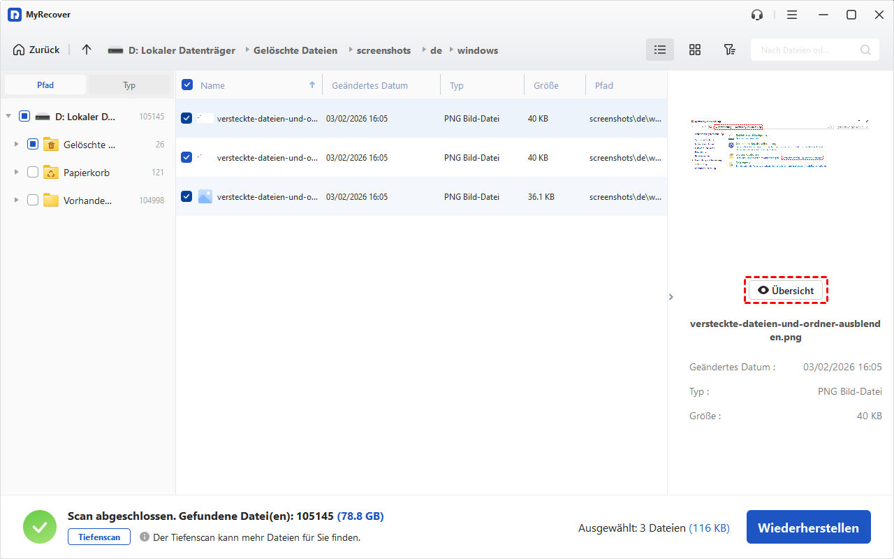 🔥 Hervorstehende Funktionen: Suchen, Filtern und Vorschau. Mit ihnen können Sie gewünschte Dateien schnell lokalisieren und sie während des Scanvorgangs wiederherstellen.