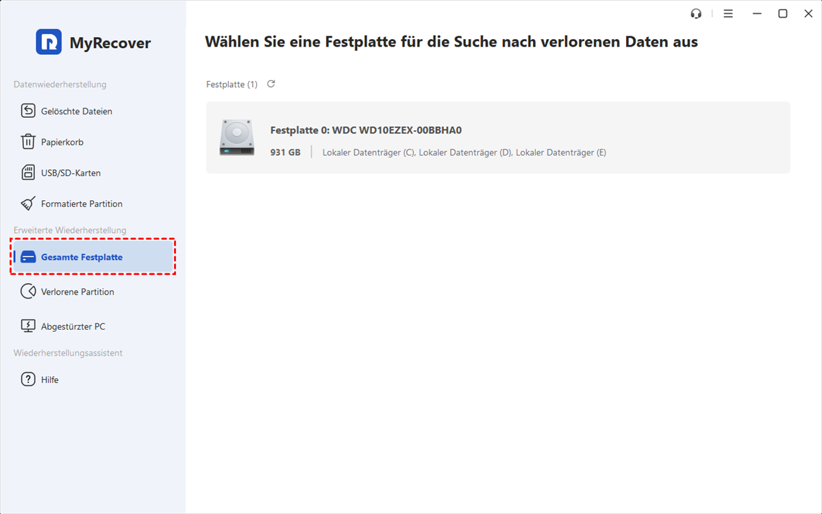 Wenn in Windows 11 oder 10 die Fehlermeldung „Datei oder Verzeichnis ist beschädigt und nicht lesbar“ auftritt, wie können Sie MyRecover zur Wiederherstellung von Dateien verwenden? Führen Sie die folgenden Schritte aus, um beispielsweise Daten von einer externen Festplatte wiederherzustellen: