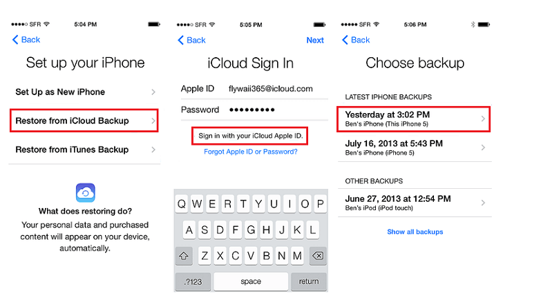 Schritt 4: Melden Sie sich in Ihrem iCloud-Konto an und wählen Sie das Backup mit den dauerhaft gelöschten Sprachmemos aus, die Sie wiederherstellen möchten.
