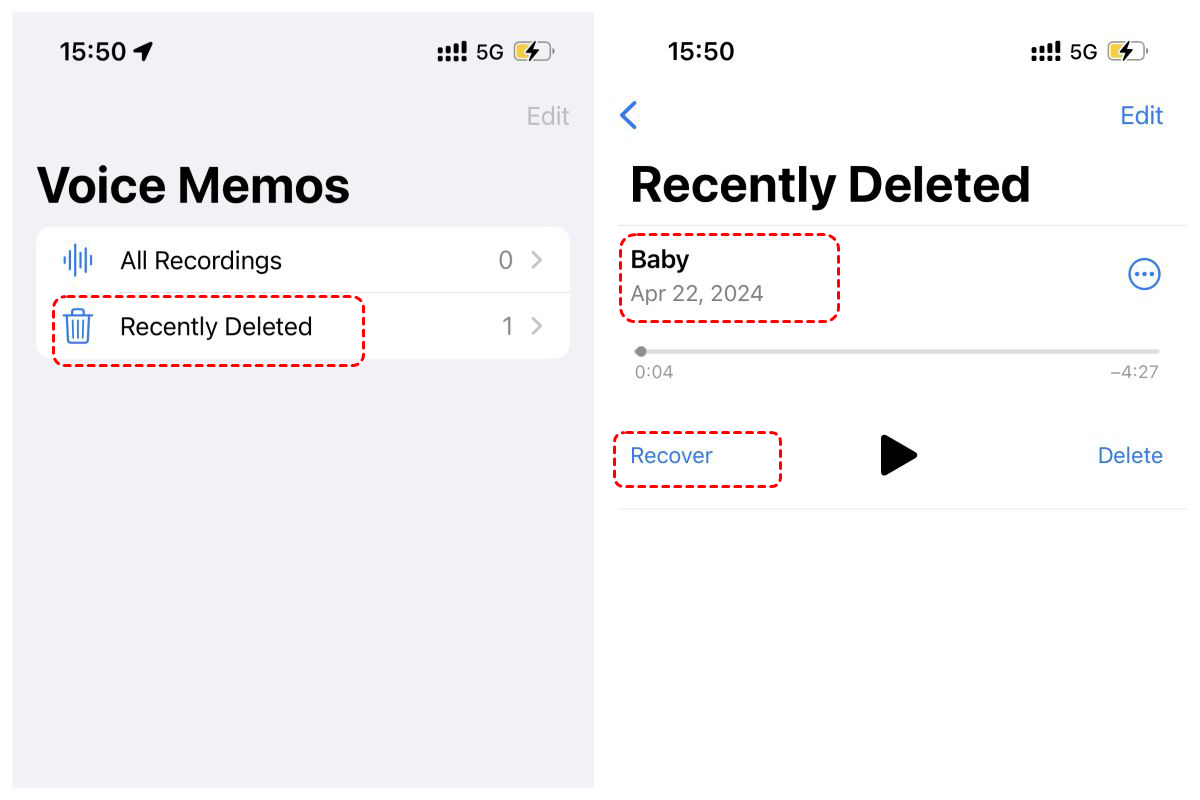 Wenn Sie gelöschte Sprachmemos wiederherstellen möchten, überprüfen Sie zunächst den Ordner „Zuletzt gelöscht“ (in dem gelöschte Dateien 30 Tage lang gespeichert werden), um festzustellen, ob die Sprachmemos endgültig gelöscht wurden. Befinden sie sich noch im Ordner, können Sie sie direkt wiederherstellen. Sind sie dort nicht mehr vorhanden, wurden sie endgültig gelöscht.