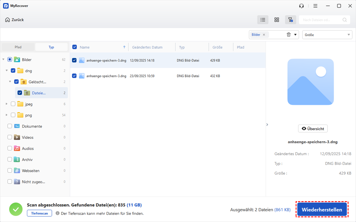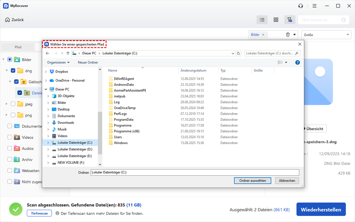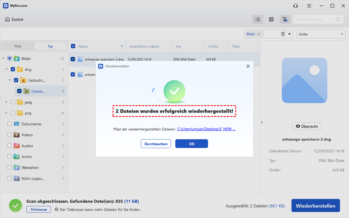 Sollten die oben genannten Befehle Ihr Problem nicht beheben, empfiehlt sich der Einsatz einer Datenrettungssoftware wie MyRecover. Diese kostenlose Software kann Ihre SD-Karte nach verlorenen oder gelöschten Dateien durchsuchen, selbst wenn das Dateisystem beschädigt oder die Karte nicht lesbar ist.