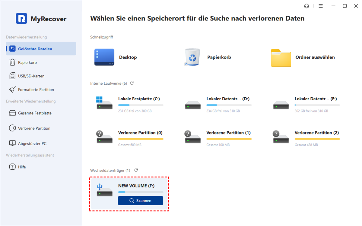 Schritt 3. Starten Sie die MyRecover-Anwendung. Wählen Sie in der Software Ihre SD-Karte aus der Liste der verfügbaren Laufwerke aus. Klicken Sie anschließend auf „Scannen“.