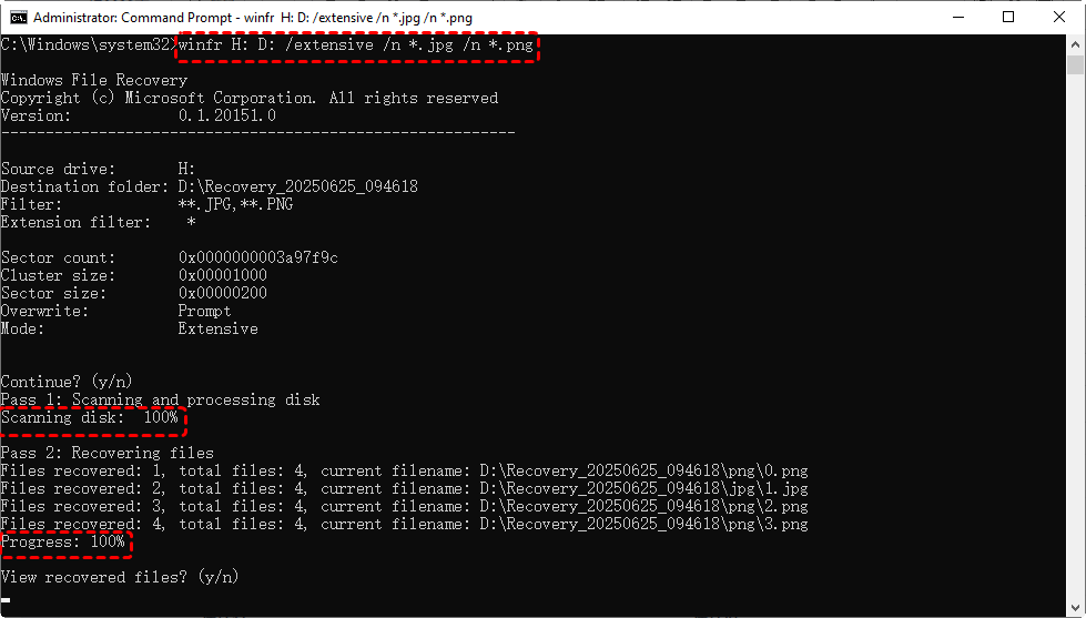 /n *.png und /n *.jpg: Dies weist die Windows-Dateiwiederherstellung an, alle Dateien mit der Erweiterung .png bzw. .jpg zu suchen und wiederherzustellen. Die Anführungszeichen stellen sicher, dass der Platzhalter korrekt interpretiert wird.