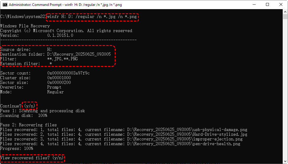 Diese Methode erfordert jedoch die manuelle Eingabe von Befehlszeilenparametern und Vorkenntnisse über das Dateisystem der Festplatte (NTFS/FAT32/exFAT), den Quellpfad, den Zielpfad und weitere Informationen. Unerfahrene Benutzer bleiben sehr wahrscheinlich bei 99 % hängen oder scheitern bei der Datenwiederherstellung komplett mit verschiedenen Fehlermeldungen wie xxx aufgrund falscher Parameter oder verändern versehentlich sogar andere Dateien.
