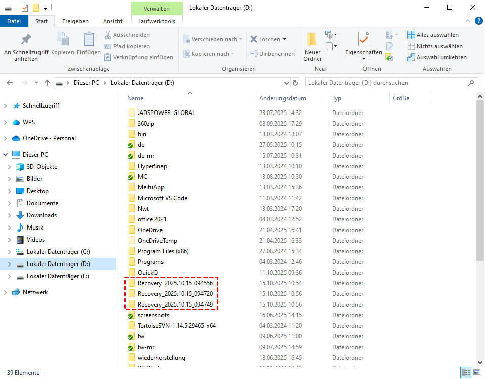 Navigieren Sie zu Ihrem Ziellaufwerk (z. B. D:\Recovery). Die Dateien werden in einem Ordner namens „Recovery_[Datum]“ wiederhergestellt.