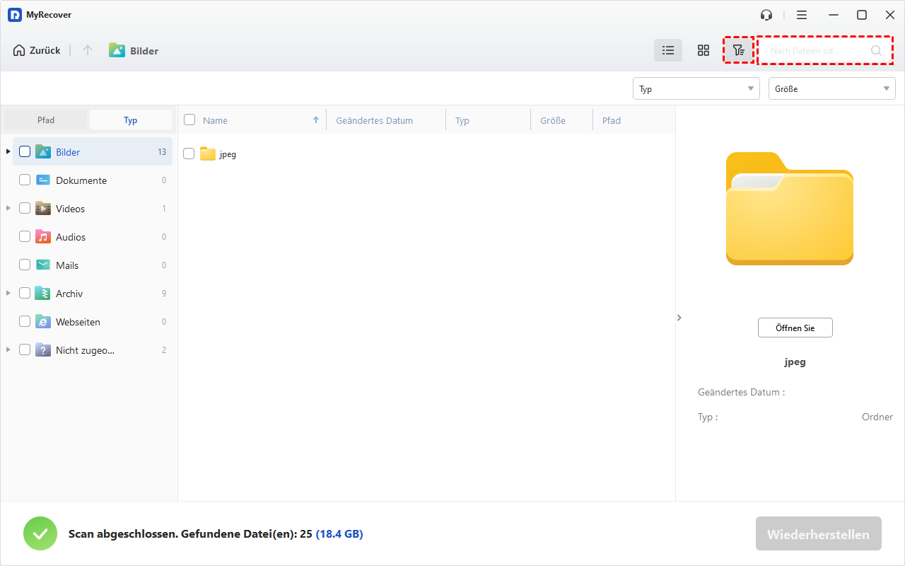 🍕 Suchen, filtern Sie bestimmte Dateien oder Ordner und vorschauen Sie sie, um sicherzustellen, dass Sie die richtigen Dateien für die Wiederherstellung ausgewählt haben.