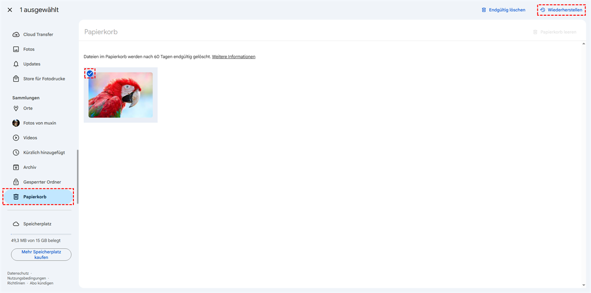 Gelöschte Elemente, die im Google Fotos-Papierkorb gespeichert sind, werden nach 60 Tagen endgültig gelöscht.