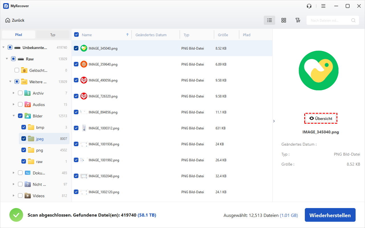 3. Es wird ein Tiefenscan durchgeführt, um die gelöschte Partition gründlich nach verlorenen Dateien zu durchsuchen. Sie können die Ergebnisse durchsuchen und die gewünschten Dateien markieren. Um sicherzustellen, dass Sie die benötigten Dateien wiederherstellen, verwenden Sie die Funktion „Übersicht“.