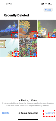 Schritt 4: Die gelöschten Screenshots auswählen. Auf „Wiederherstellen“ tippen und an einem sicheren Ort speichern.