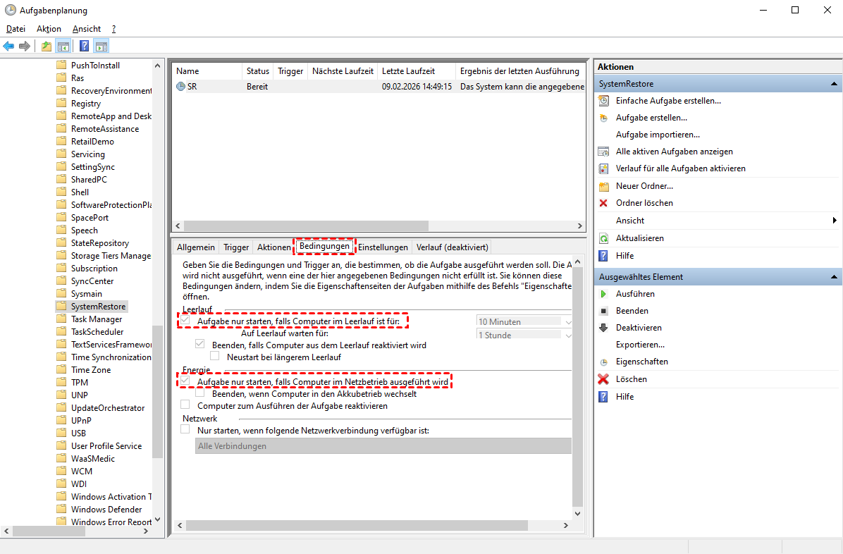 Schritt 4: Nachdem Sie eine Aufgabe bearbeitet oder neu erstellt haben, wechseln Sie zum Reiter Bedingungen. Deaktivieren Sie im Abschnitt Leerlauf die Option Aufgabe nur starten, falls Computer im Leerlauf ist für. Deaktivieren Sie im Abschnitt Energie ebenfalls die Option Aufgabe nur starten, falls Computer für im Netzbetrieb ausgeführt wird. Erstellen Sie einen Wiederherstellungspunkt und prüfen Sie, ob der Fehler wegen fehlender Wiederherstellungspunkte weiterhin besteht.