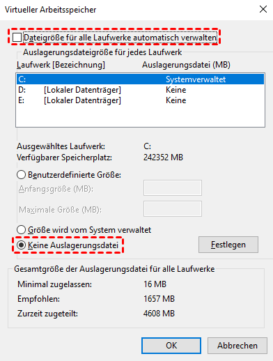 Schritt 3. Deaktivieren Sie die Option Dateigröße für alle Laufwerk automatisch verwalten. Wählen Sie Keine Auslagerungsdatei und klicken Sie auf Festlegen.