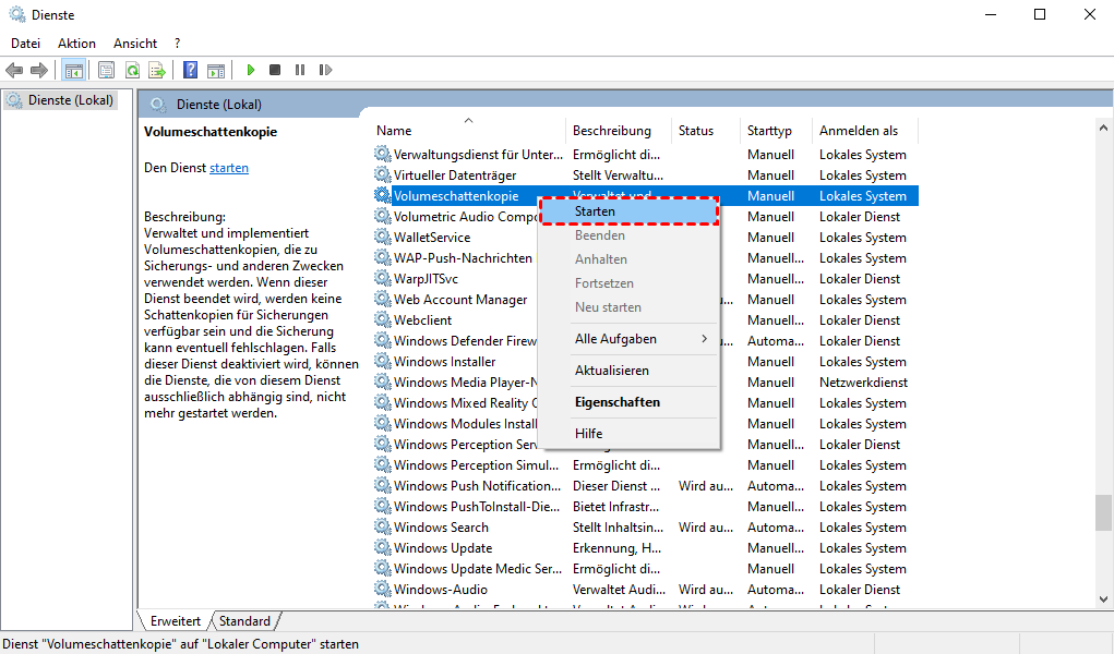 Schritt 2. Im Fenster Dienste suchen Sie Volumeschattenkopie, klicken Sie mit der rechten Maustaste darauf und wählen Sie Starten. Sie können nach dem Erstellen eines Wiederherstellungspunkts überprüfen, ob der Fehler mit fehlenden Wiederherstellungspunkten weiterhin auftritt.
