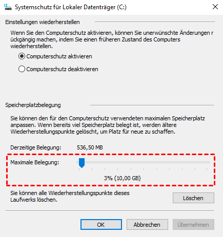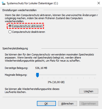 Schritt 3. Wenn sie deaktiviert ist, aktivieren Sie sie, um mit der Erstellung neuer Wiederherstellungspunkte zu beginnen.