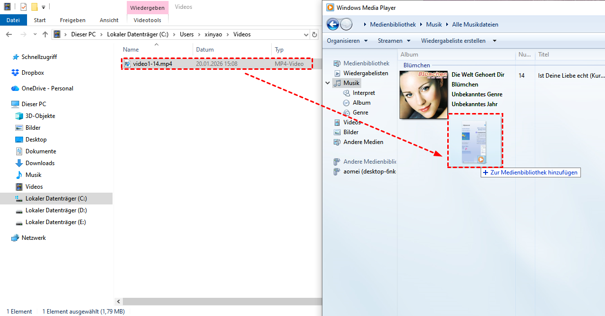 Falls Sie versehentlich nur die Option „Nur aus der Bibliothek löschen“ gewählt haben, ist die Wiederherstellung einfach: Navigieren Sie zum Standardordner auf Ihrem Computer, in dem Mediendateien gespeichert werden (z. B. C:\Benutzer\[IhrBenutzername]\Musik oder Videos). Suchen Sie die gelöschte Datei in diesem Ordner. Ziehen Sie die Datei einfach per Drag & Drop zurück in das Bibliotheksfenster des Windows Media Players, und sie wird wieder hinzugefügt.