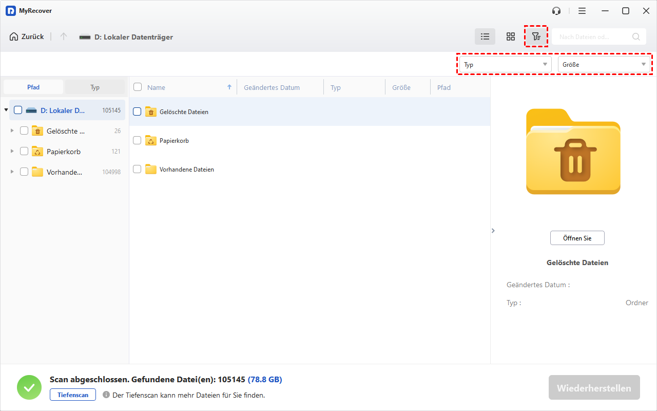 - Bietet Filter- und Vorschaufunktion bei der Ausführung von Schnellscan und Tiefenscan.
