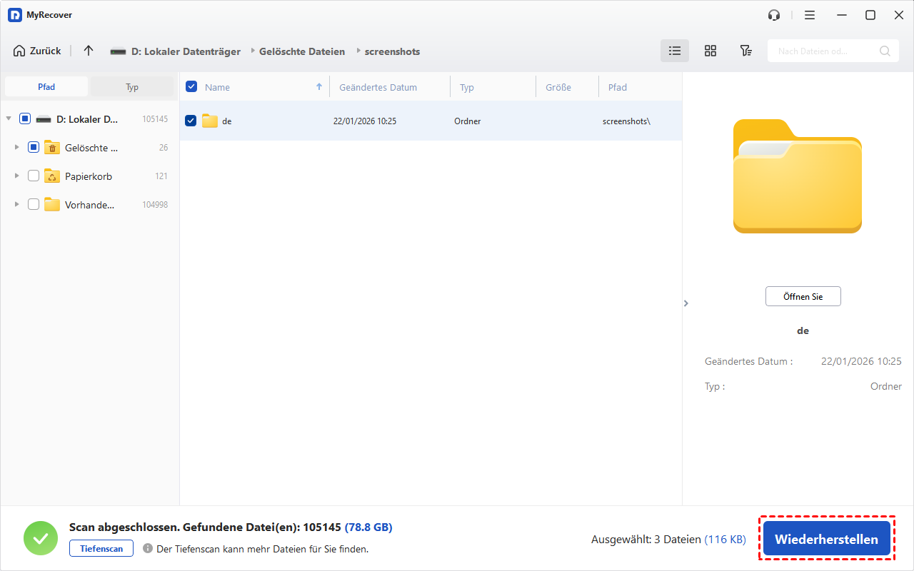 MyRecover ist eine großartige Alternative aufgrund seiner Umfassendheit, Benutzerfreundlichkeit und Kompatibilität. Es dient dazu, gelöschte und verlorene Dateien von verschiedenen lokalen Speichermedien wie Festplatten, USB-Sticks oder SD-Karten wiederherzustellen.