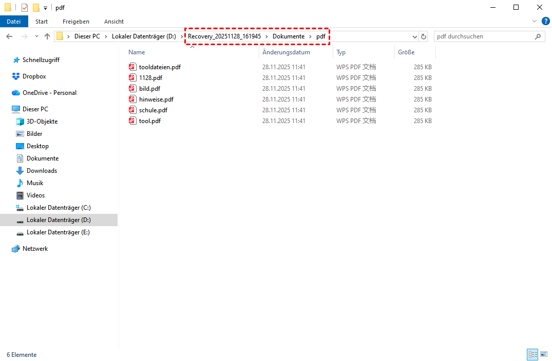 Beispiel: Wiederherstellung von PDF-Dateien von Partition G: auf Partition D: