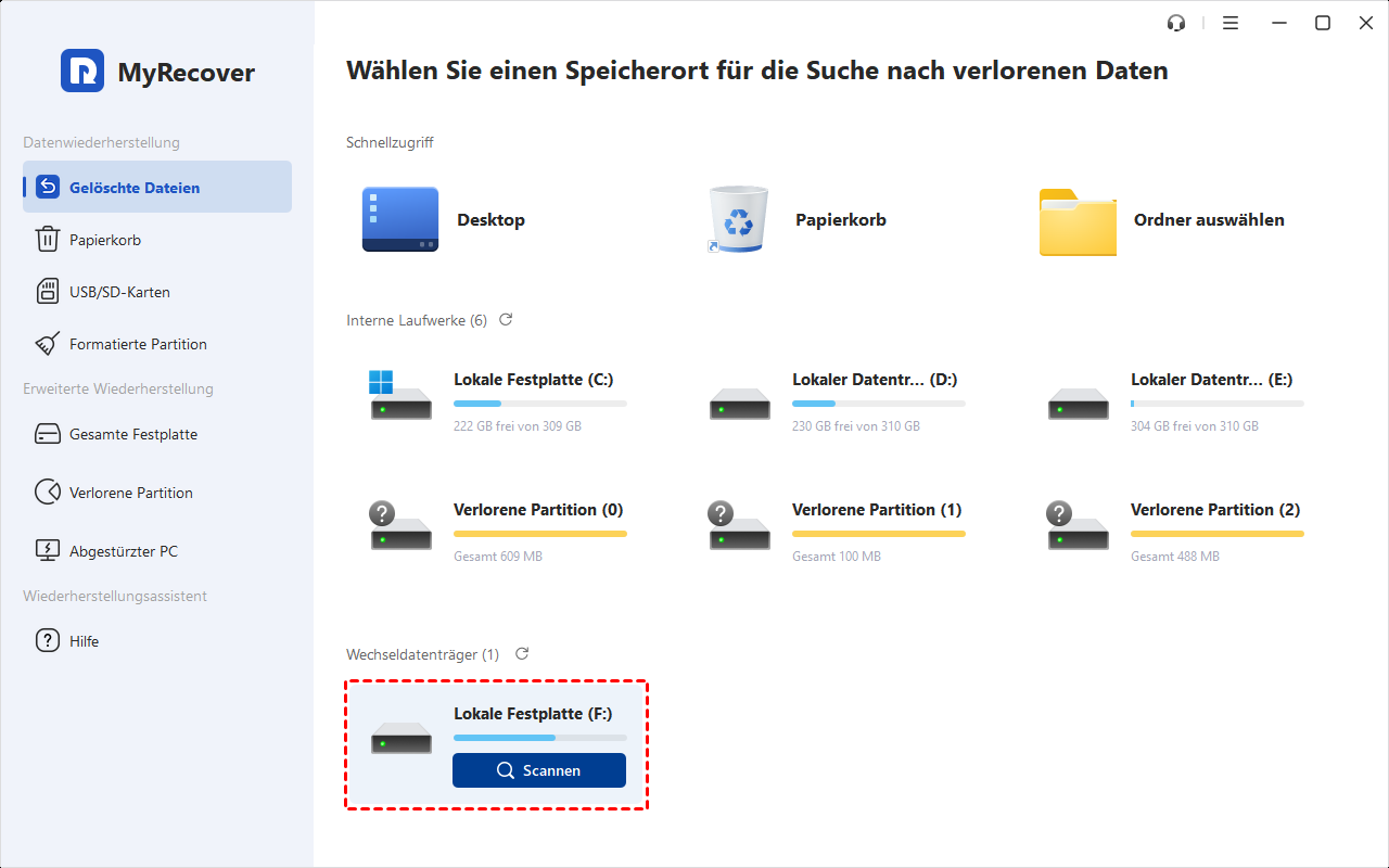 Schritt 2. Legen Sie die SD-Karte Ihrer Nikon-Kamera in Ihren Computer ein. Starten Sie MyRecover und suchen Sie die SD-Karte unter „Wechseldatenträger“. Klicken Sie darauf und anschließend auf Scannen, um den Scanvorgang zu starten.