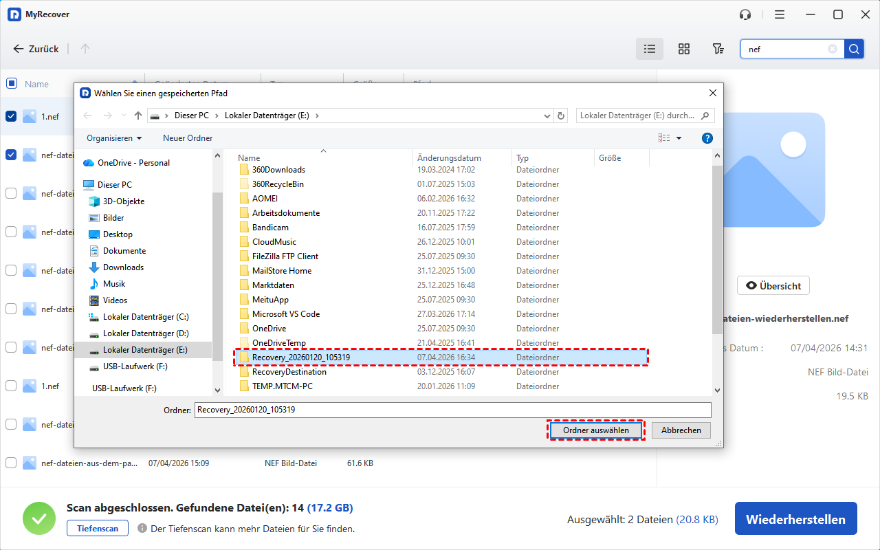 Schritt 4. Wählen Sie die NEF-Datei aus, die Sie wiederherstellen möchten. Klicken Sie auf Wiederherstellen und wählen Sie dann ein anderes Laufwerk (nicht die SD-Karte) zum Speichern der wiederhergestellten Datei aus.