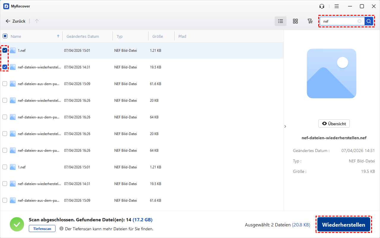 Schritt 3. MyRecover führt automatisch einen Schnellscan durch, um gelöschte Dateien zu finden, oder einen Tiefenscan, um beschädigte oder formatierte Laufwerke aufzuspüren und so alle gelöschten und fehlenden Dateien zu finden. Sie können die Suchleiste verwenden, um .nef-Dateien schnell zu finden.