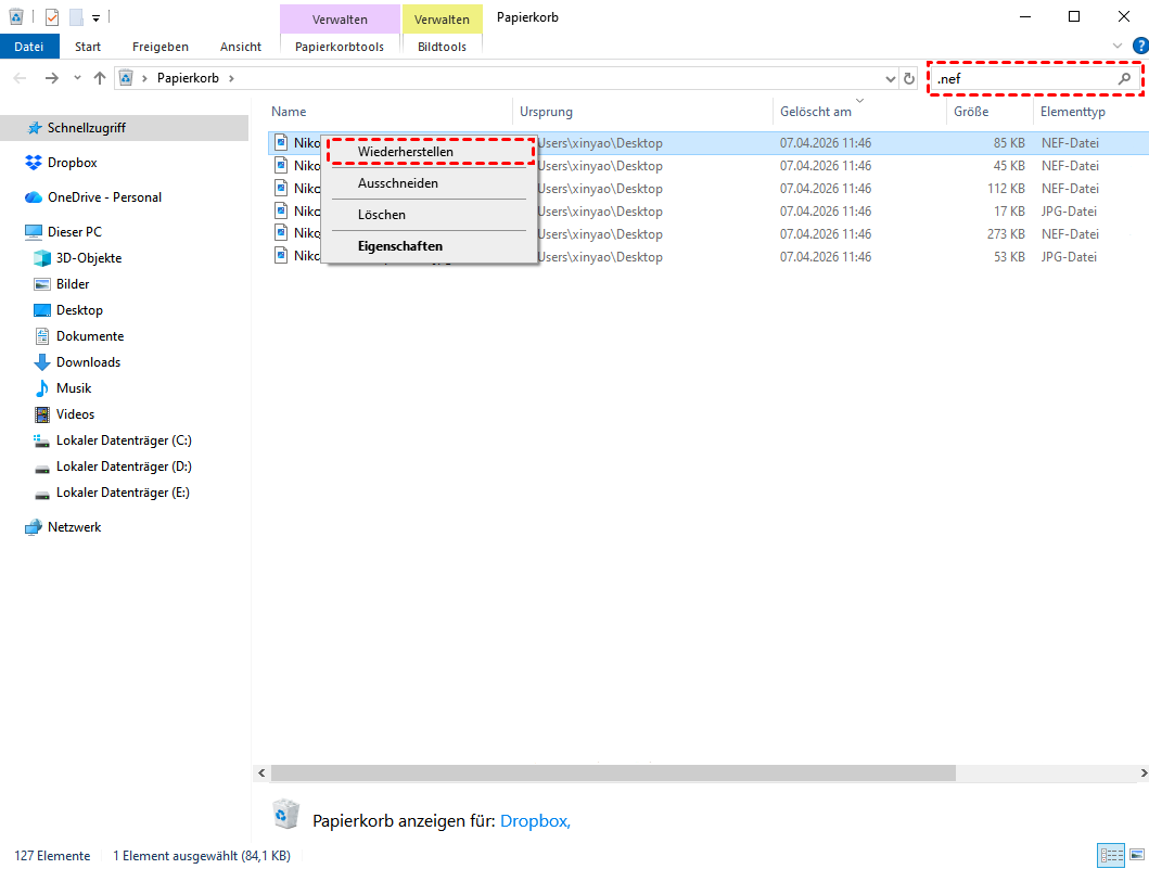 Manchmal legen Sie die SD-Karte Ihrer Kamera in Ihren Computer ein oder importieren NEF-Dateien per Datenkabel auf Ihren Computer, um sie zu verwalten. Wenn Sie diese Dateien versehentlich auf Ihrem Computer löschen, werden sie vorübergehend im Windows-Papierkorb gespeichert und können so leicht wiederhergestellt werden. Die einzelnen Schritte sind wie folgt: