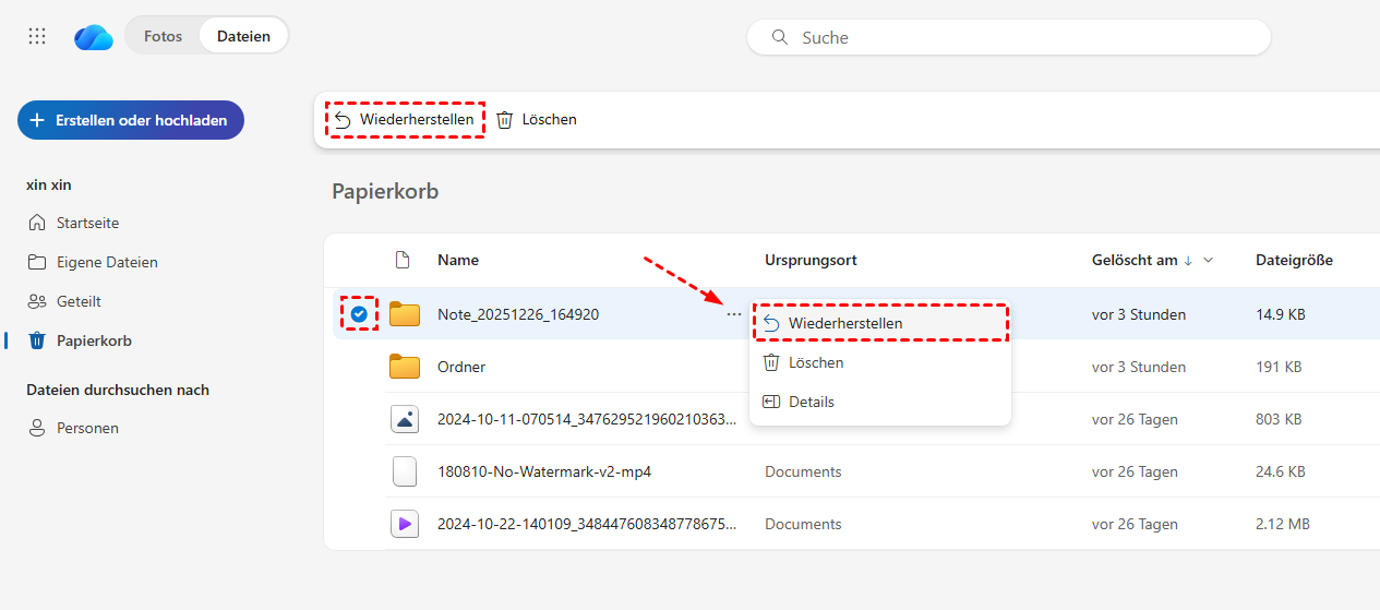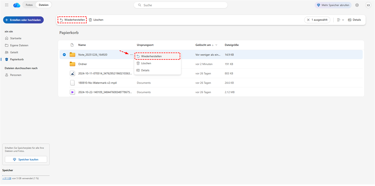 Schritt 5: Klicken Sie im oberen Menü auf „Wiederherstellen“. Das ausgewählte Notizbuch wird an seinen ursprünglichen Speicherort in OneDrive zurückverschoben.