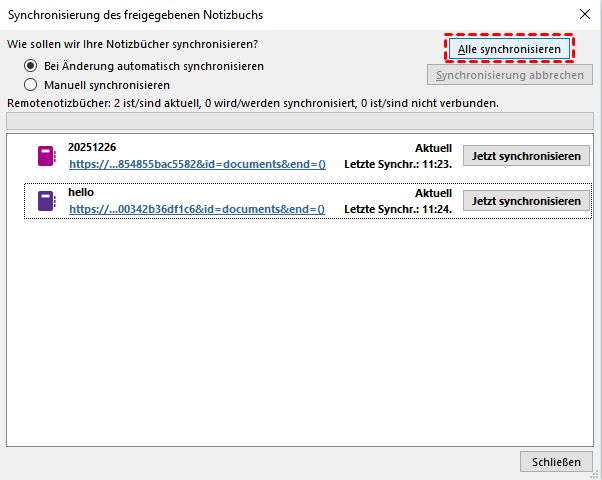 - Bei anhaltenden Problemen können Sie „Alle synchronisieren“ auswählen oder das Notebook schließen und erneut öffnen.