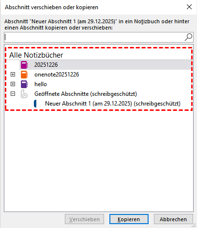 Schritt 4: Wählen Sie im Dialogfeld „Verschieben oder Kopieren“ den Notizbuchabschnitt aus, in dem Sie die Notiz wiederherstellen möchten.