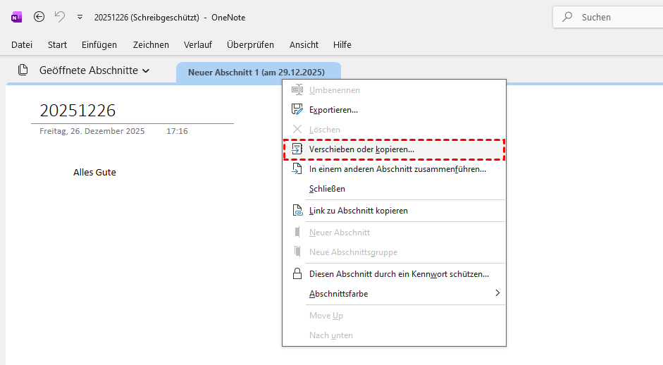 Schritt 4: Die Notiz wird nun in OneNote geöffnet. Klicken Sie mit der rechten Maustaste auf den Seitennamen oben. Wählen Sie im Menü „Verschieben oder Kopieren“.