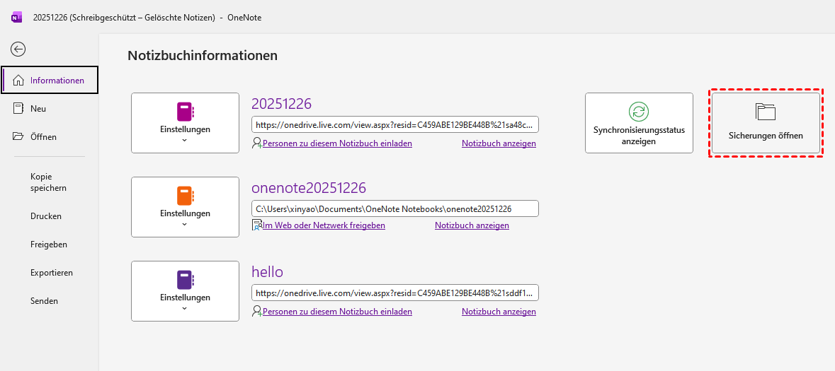 Schritt 1: Öffnen Sie OneNote und klicken Sie oben links auf „Datei“>„Informationen“. Wählen Sie im Menü „Sicherungen öffnen“.