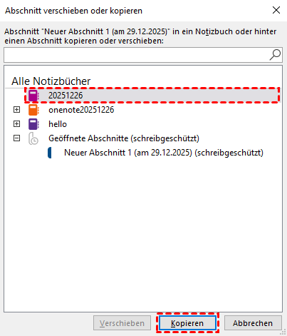 Schritt 5: Wählen Sie im Popup-Fenster das Notizbuch oder den Abschnitt aus, in den Sie die wiederhergestellten Notizen verschieben möchten, und klicken Sie auf „Kopieren“.