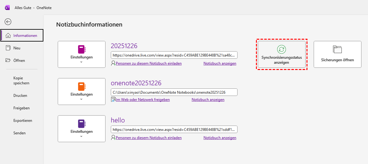Schritt 1: Öffnen Sie OneNote und gehen Sie zu „Datei > Informationen“. Klicken Sie neben dem betroffenen Notizbuch auf „Synchronisierungsstatus anzeigen“.