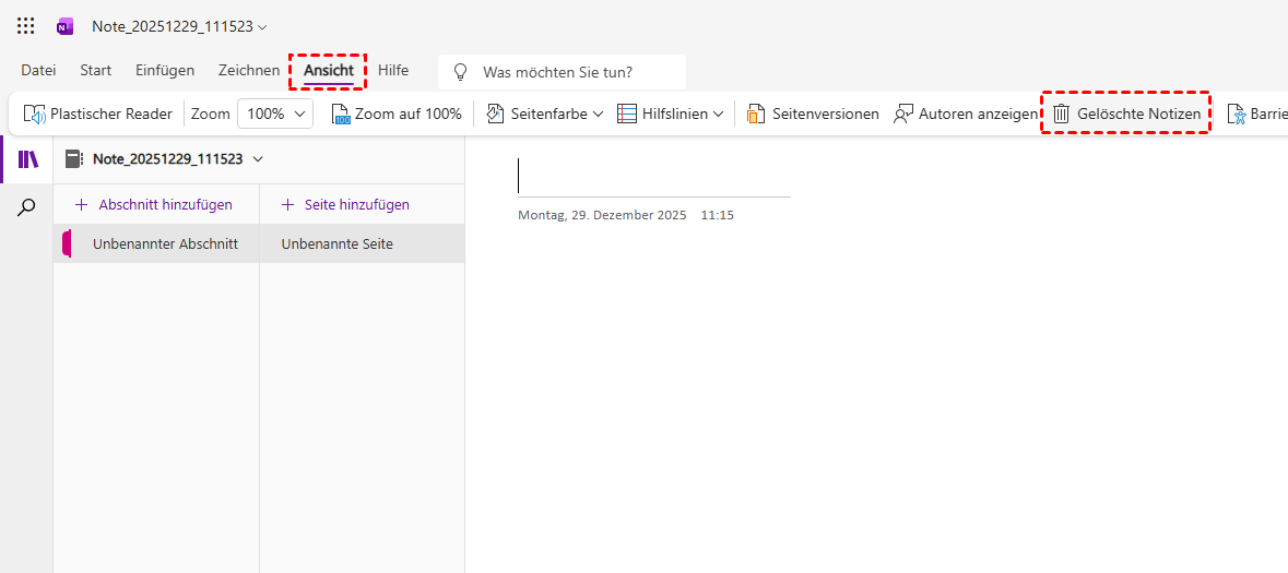 OneNote verschiebt gelöschte Seiten und Abschnitte automatisch in den „Notizbuch-Papierkorb“. Dort bleiben sie für eine begrenzte Zeit, bevor sie endgültig gelöscht werden. Überprüfen Sie daher am besten zuerst den Papierkorb, bevor Sie andere Schritte unternehmen.