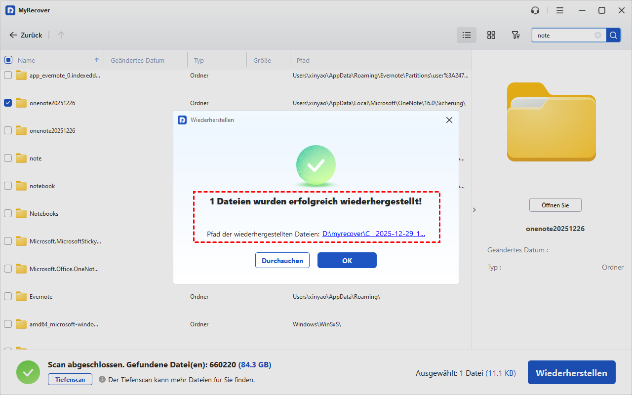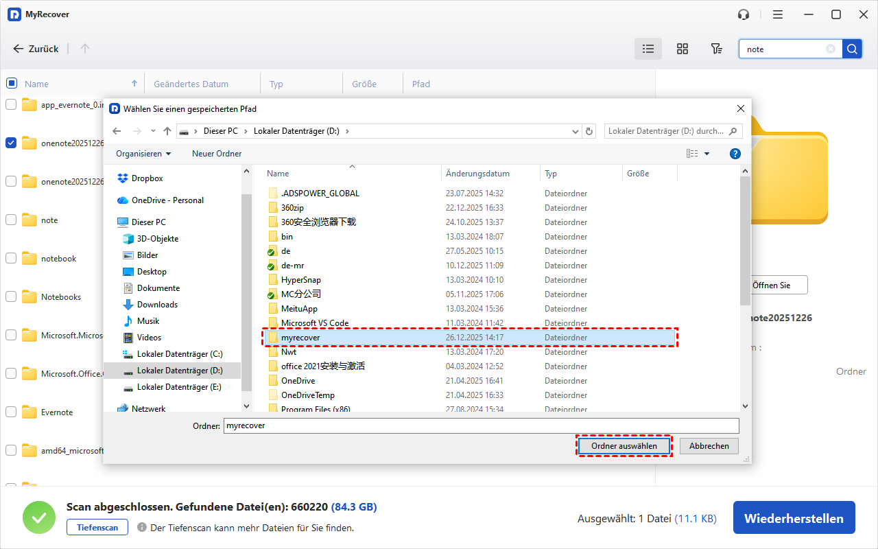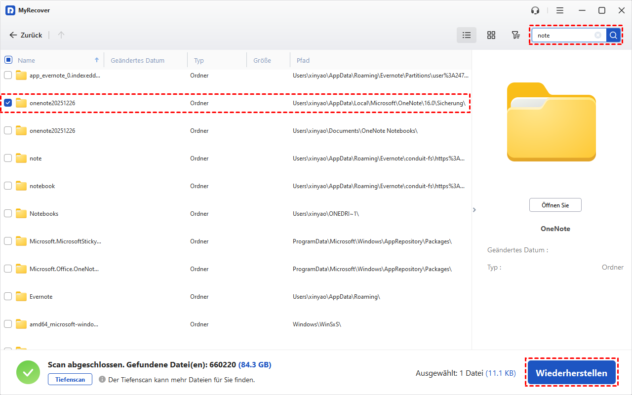 Wenn die bisherigen Methoden nicht funktionieren – oder wenn Ihr OneNote-Notizbuch endgültig gelöscht wurde und sich auch nicht mehr im Papierkorb befindet – ist die Verwendung eines professionellen Datenrettungstools wie MyRecover oft die beste Lösung.